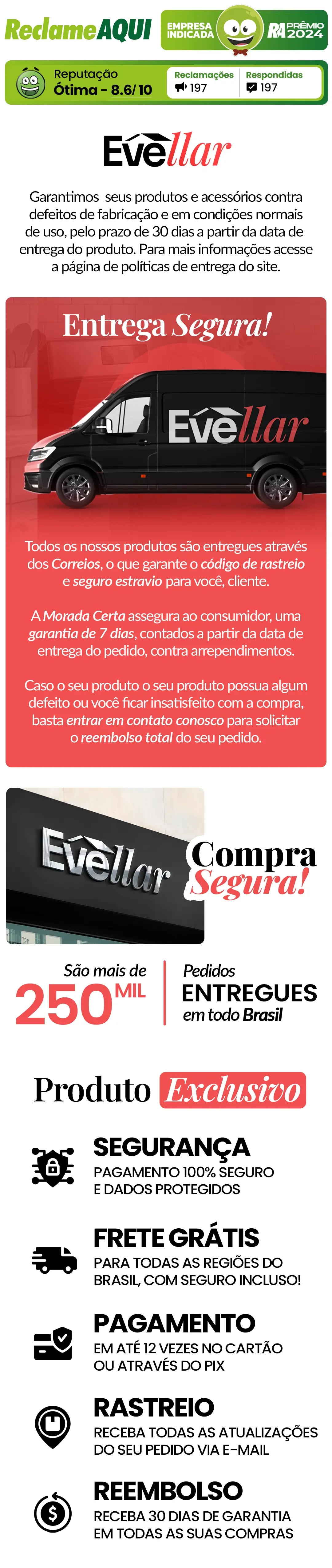 Reembolso 100% do seu dinheiro em até 7 dias após o recebimento da mercadoria.
